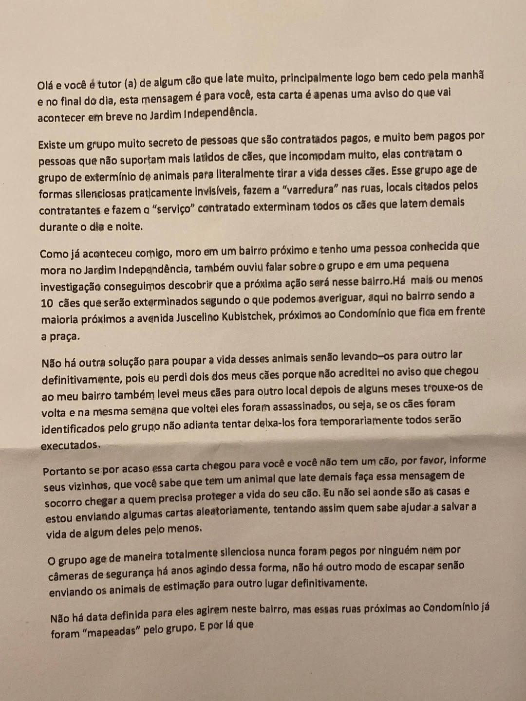 A carta fala sobre um suposto grupo que estaria “eliminando” cães que latem muito. Segundo o texto, esse grupo agiria de forma silenciosa e teria como alvo animais de bairros como o Jardim Independência e ruas próximas à Avenida Juscelino Kubitschek, perto de um condomínio em frente a uma praça — regiões que ficam próximas ao Alves Dias.