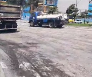 O bloqueio na via causa lentidão desde a garagem da Viação ABC até o Vencedor Atacadista.
