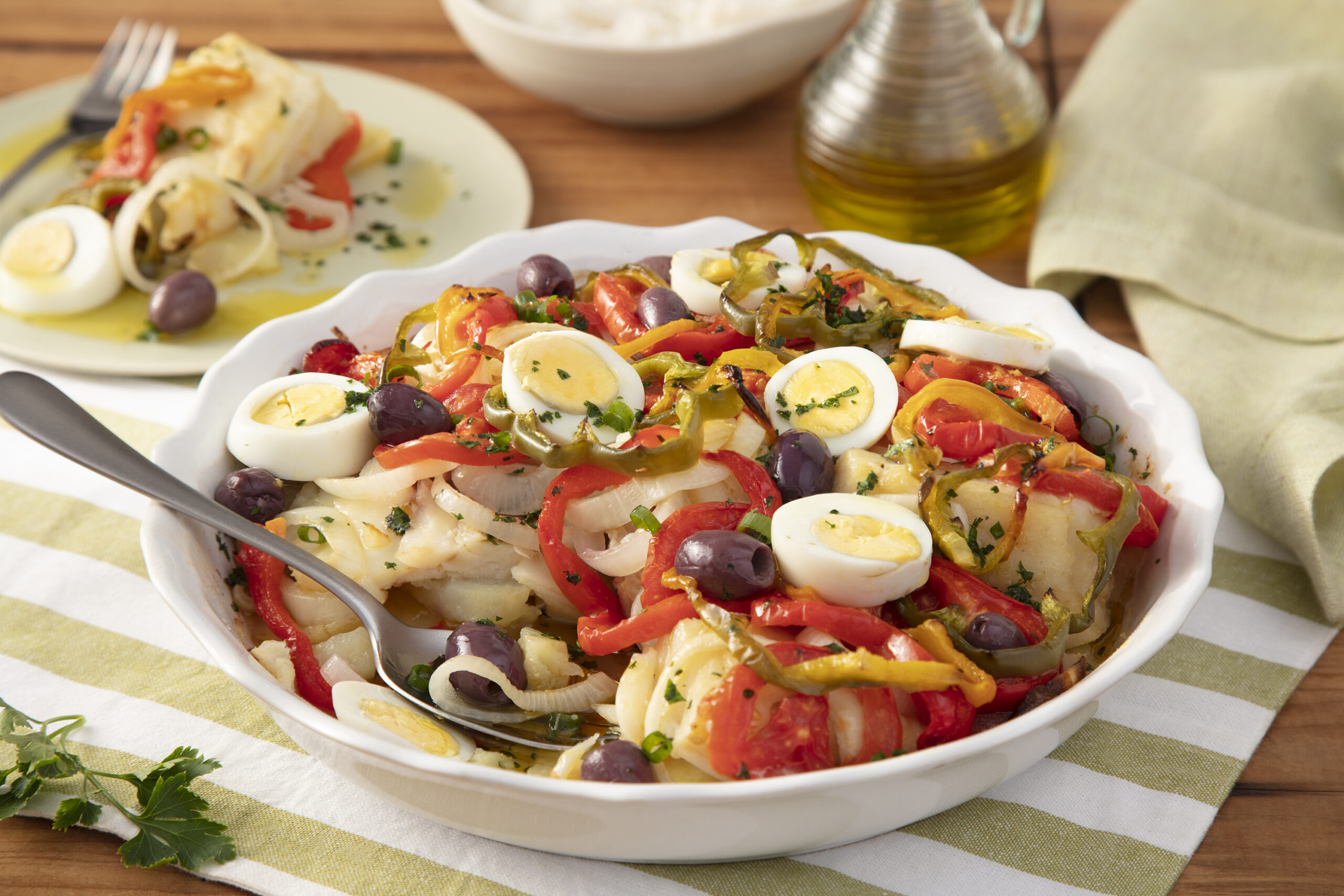 - Monte camadas de batatas temperadas, bacalhau e legumes.