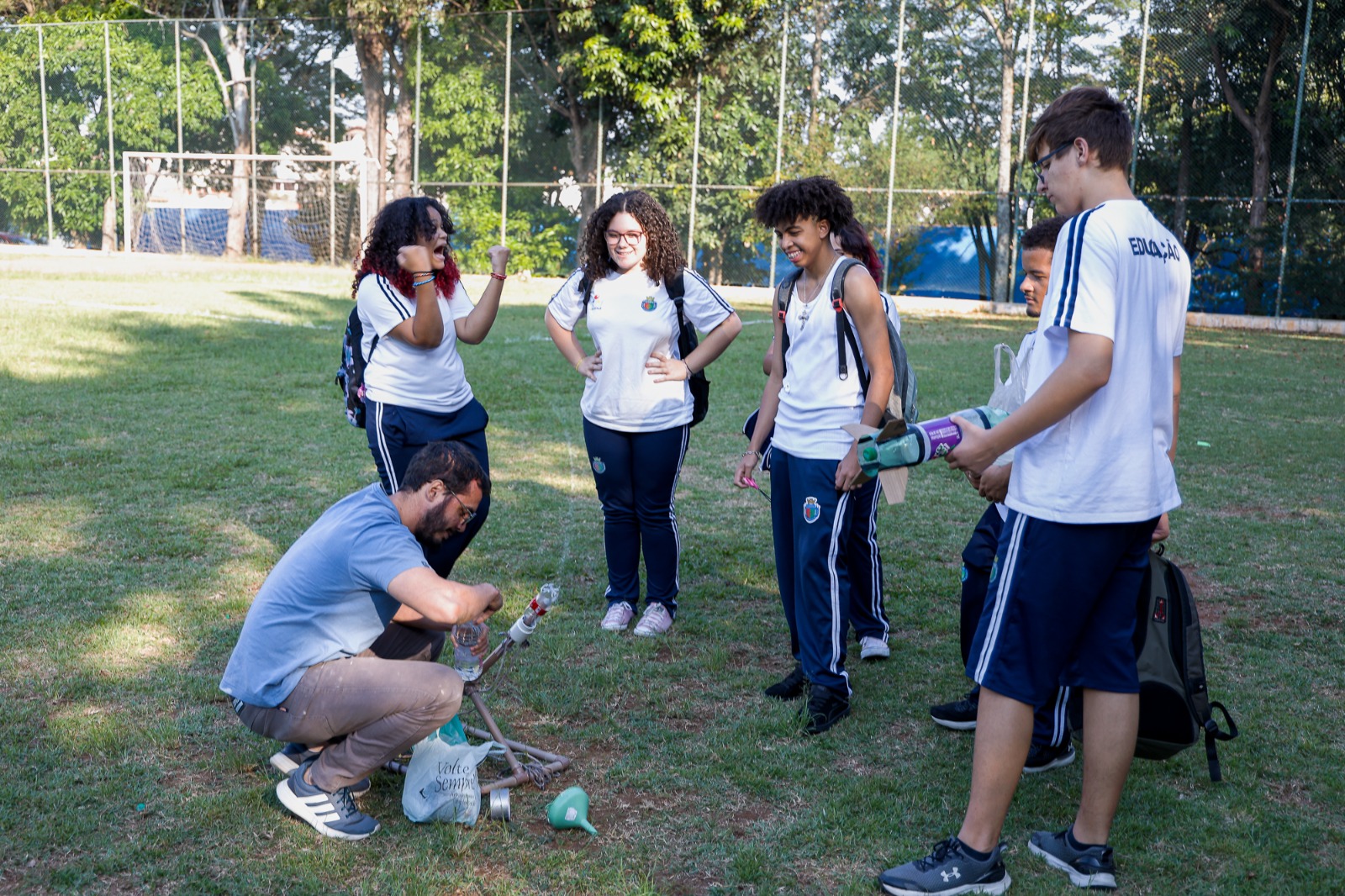 Seis alunos, sendo três meninos e três meninas, lançaram seus primeiros foguetes no campo de futebol do Clube Águias de Nova Gerty, que fica ao lado do Alcina. A satisfação foi imensa quando o vinagre e o bicarbonato se misturaram assim que a bexiga cheia do líquido estourou em um prego. A garrafa pet voou de uma ponta à outra do campo, atravessando a área como se fosse um cruzamento ao atacante.