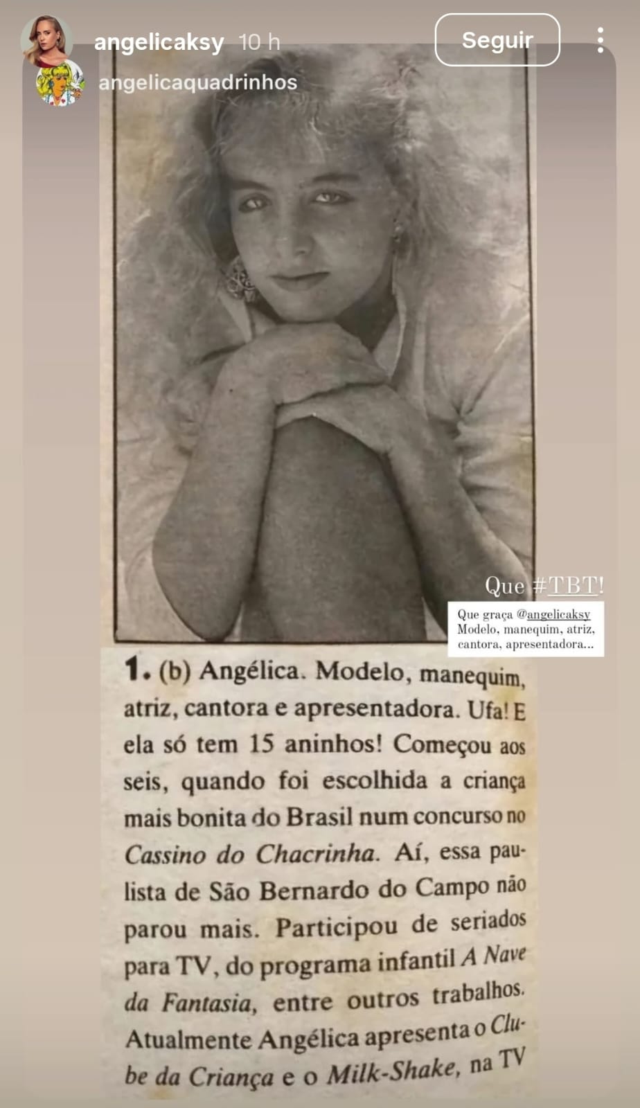 Neste domingo (8), a apresentadora Angélica repostou um #TBT com um recorte de jornal antigo que resgata o início de sua carreira na TV. A curiosidade apareceu no story publicado por ela em sua rede social, com uma lembrança dos tempos em que despontava na televisão ainda adolescente, quando tinha 15 anos. Embora tenha nascido em Santo André, Angélica foi criada em São Bernardo — informação que nem todo mundo conhece.