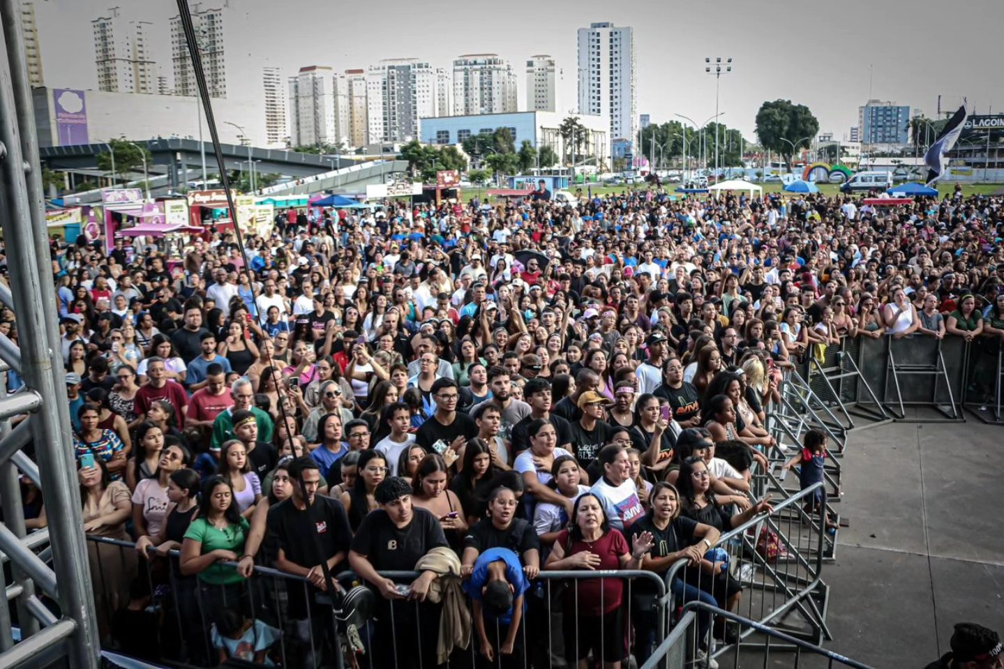 ADORAÇÃO – A programação musical começou com Matheus Goulart, que conduziu o público em momentos de louvor. Em seguida, o cantor PG se apresentou com repertório autoral. Por volta das 20h10, Sarah Farias subiu ao palco e conduziu momentos de oração. O encerramento ficou por conta de Thalles Roberto, que destacou o caráter solidário do encontro. “Esse é um show que vai além da adoração. É um show de solidariedade”, afirmou.