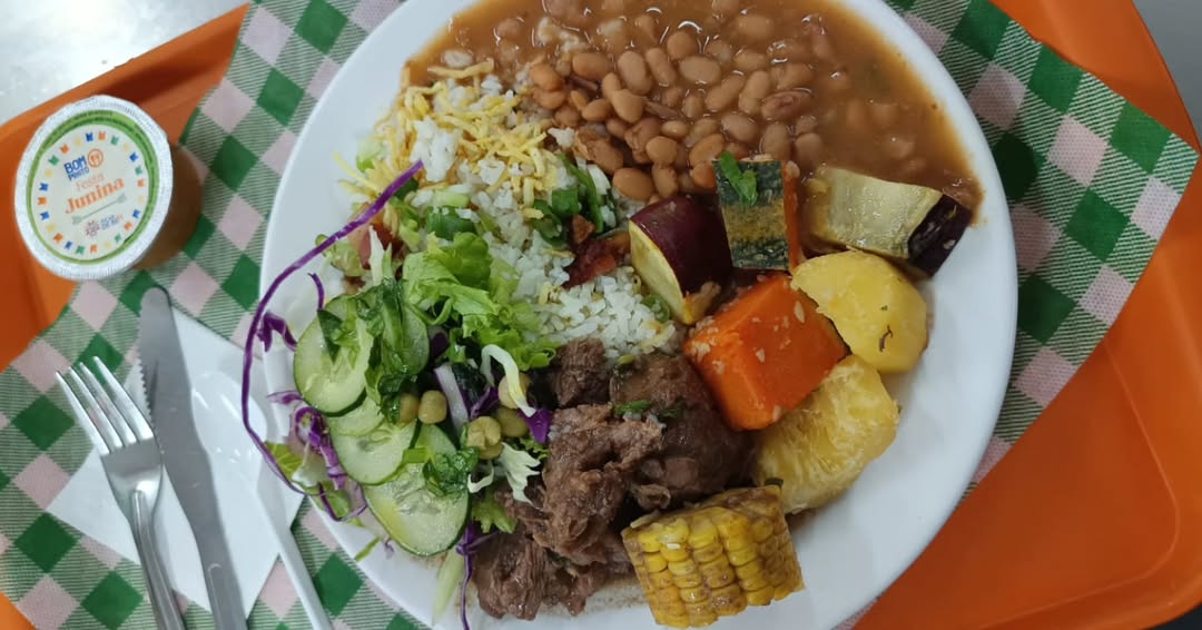 O cardápio inclui carne louca como prato principal, arroz à primavera, feijão carioca, batata palito assada com bacon como guarnição, salada francesa e, de sobremesa, bala de goma. A refeição será servida por R$ 1, das 10h30 às 14h ou até o término das cotas disponíveis.
