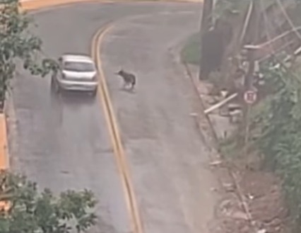 O caso foi registrado na tarde desta terça-feira (7), enquanto chovia no local. O animal está há alguns dias na via e corre atrás dos carros, chegando a invadir a pista contrária em um trecho de faixa contínua e curva acentuada.