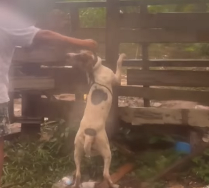 Uma família que passava de carro viu a cena, parou e conseguiu soltar o animal, que se debatia para tentar se libertar. O cachorro, cego de um dos olhos, estava se machucando com o arame e saiu correndo após ser solto.