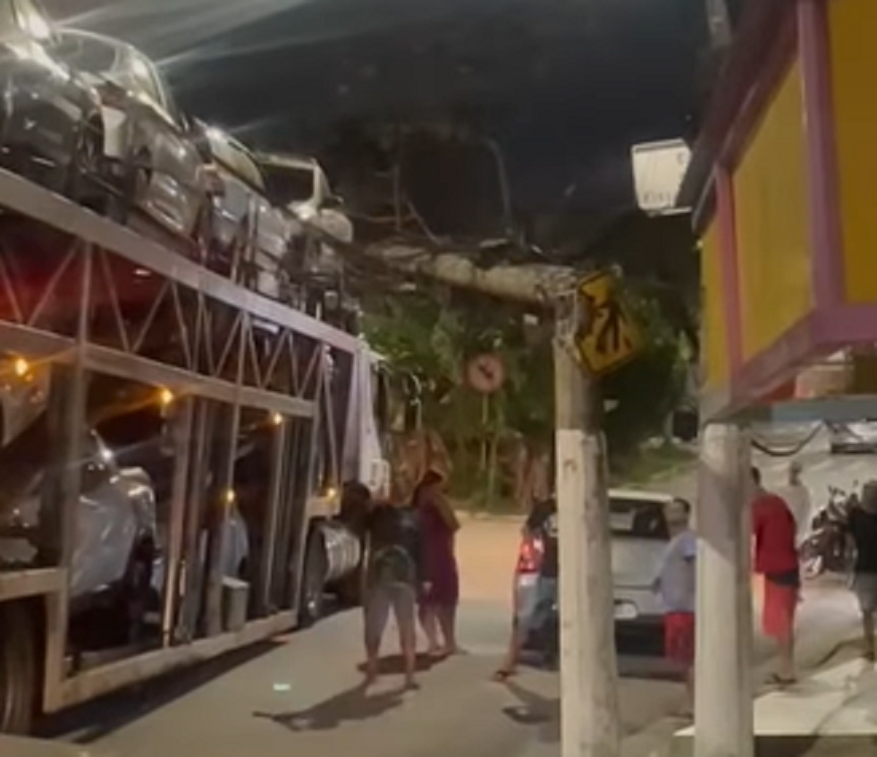 Na noite desta sexta-feira (7), um caminhão cegonha arrastou e quebrou um poste ao meio na Estrada Galvão Bueno, na altura do Jardim Represa, em São Bernardo do Campo. A estrutura ficou partida e o veículo travado no local, causando congestionamento na região.