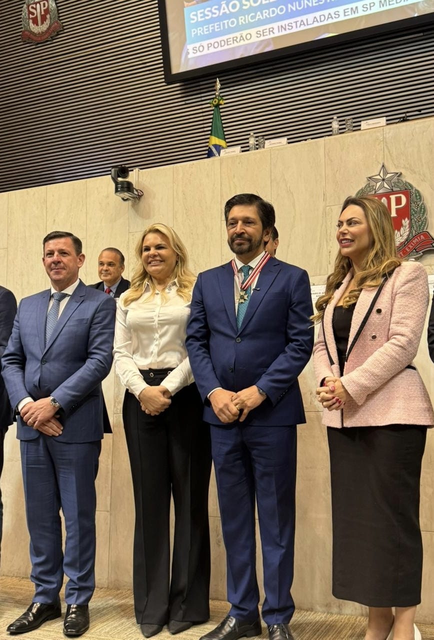 O prefeito de São Paulo, Ricardo Nunes, recebeu nesta sexta-feira (24) o Colar de Honra ao Mérito Legislativo, a mais alta condecoração concedida pela Assembleia Legislativa do Estado de São Paulo (Alesp). A homenagem foi proposta e presidida pela deputada estadual Carla Morando (PSDB), em cerimônia no Plenário Juscelino Kubitschek.