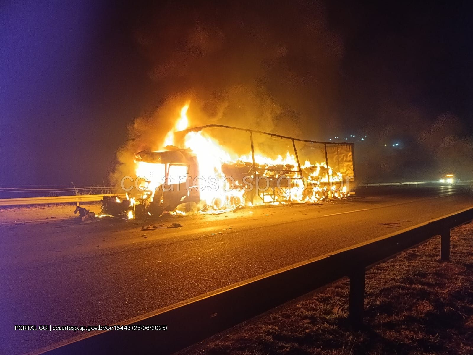 Com o impacto, houve um incêndio que consumiu completamente a carreta e a carga. O condutor não conseguiu sair a tempo e morreu carbonizado.