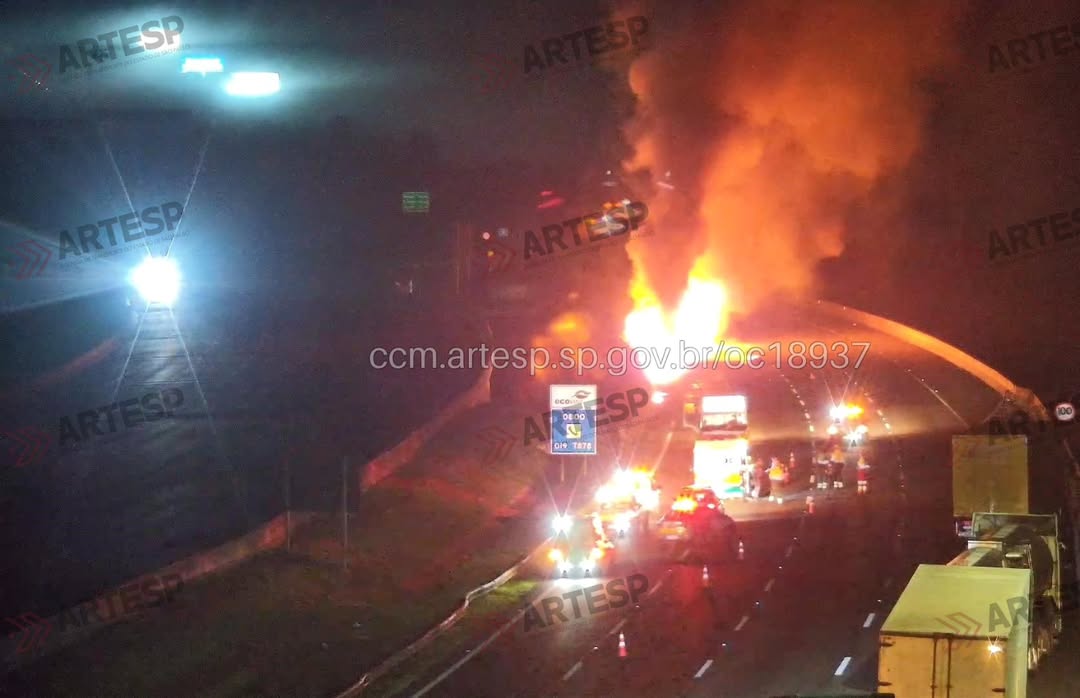 O motorista relatou que foi fechado por outra carreta, perdeu o controle da direção, tombou e atingiu a mureta de concreto e a defensa metálica. Após o impacto, o veículo pegou fogo.