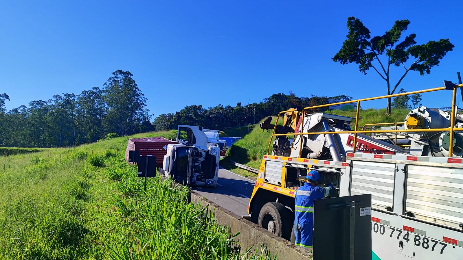 Na manhã desta terça-feira (25), por volta das 7h47, uma carreta tombou na alça de acesso do km 70 para o Rodoanel, no sentido de quem vem da Rodovia dos Imigrantes. O motorista perdeu o controle do veículo por motivo ainda desconhecido, resultando no tombamento.
