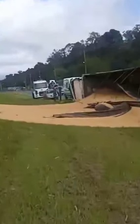 Uma carreta carregada de soja tombou no início da tarde desta terça-feira (13), por volta das 13h40, na Rodovia dos Imigrantes, na altura do km 28, sentido São Paulo. Segundo informações, o motorista teve apenas ferimentos leves e foi encaminhado ao Hospital de Urgências.