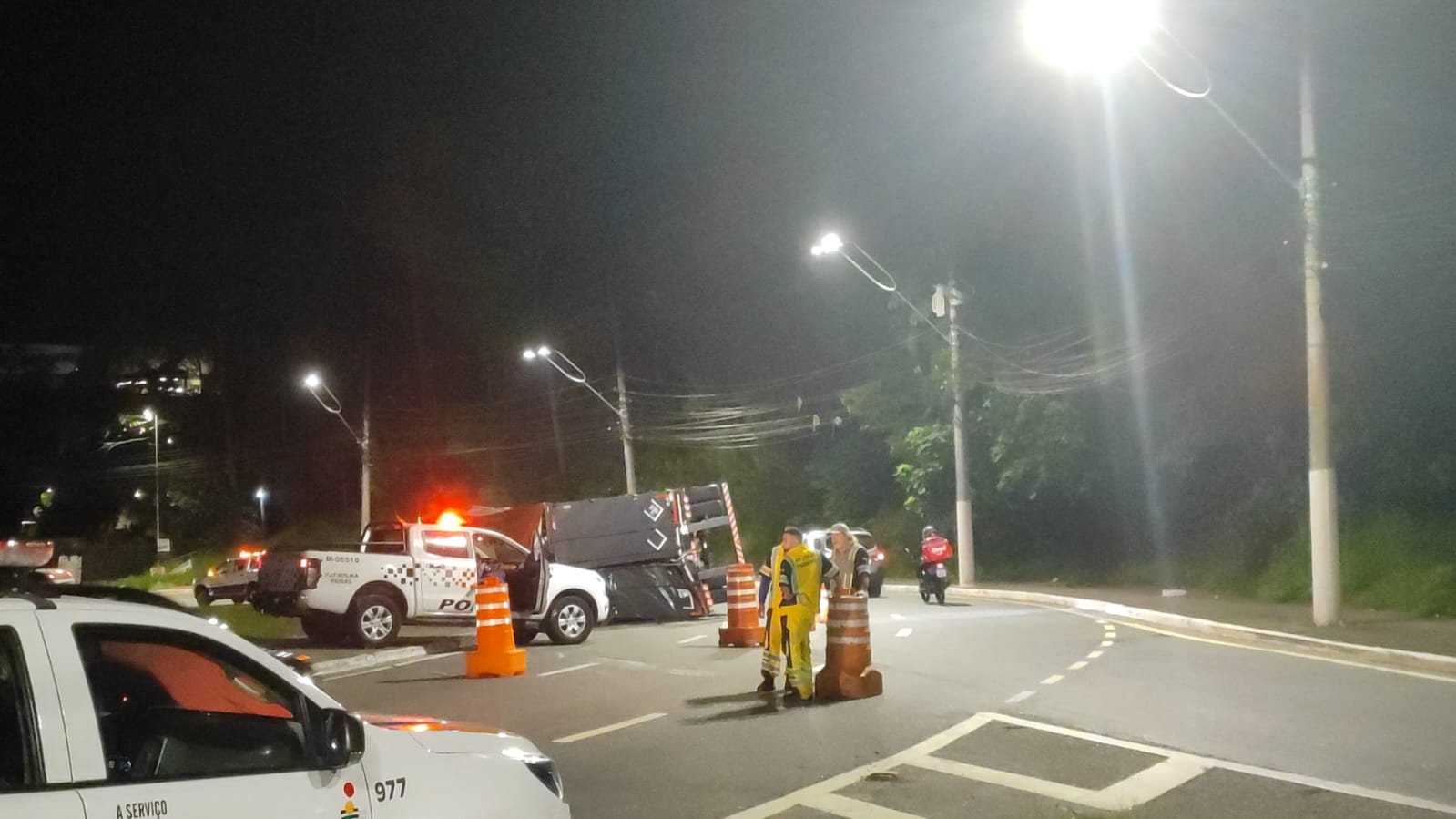 Uma carreta tombou na noite deste domingo (9) na rotatória da Estrada Galvão Bueno, na altura do Parque Imigrantes, próximo ao Outlet Premium. A Rotatória ficou interditada. O acidente ocorreu próximo ao local onde, no dia 28 de fevereiro, outra carreta tombou enquanto transportava 35 toneladas de bobinas de aço.