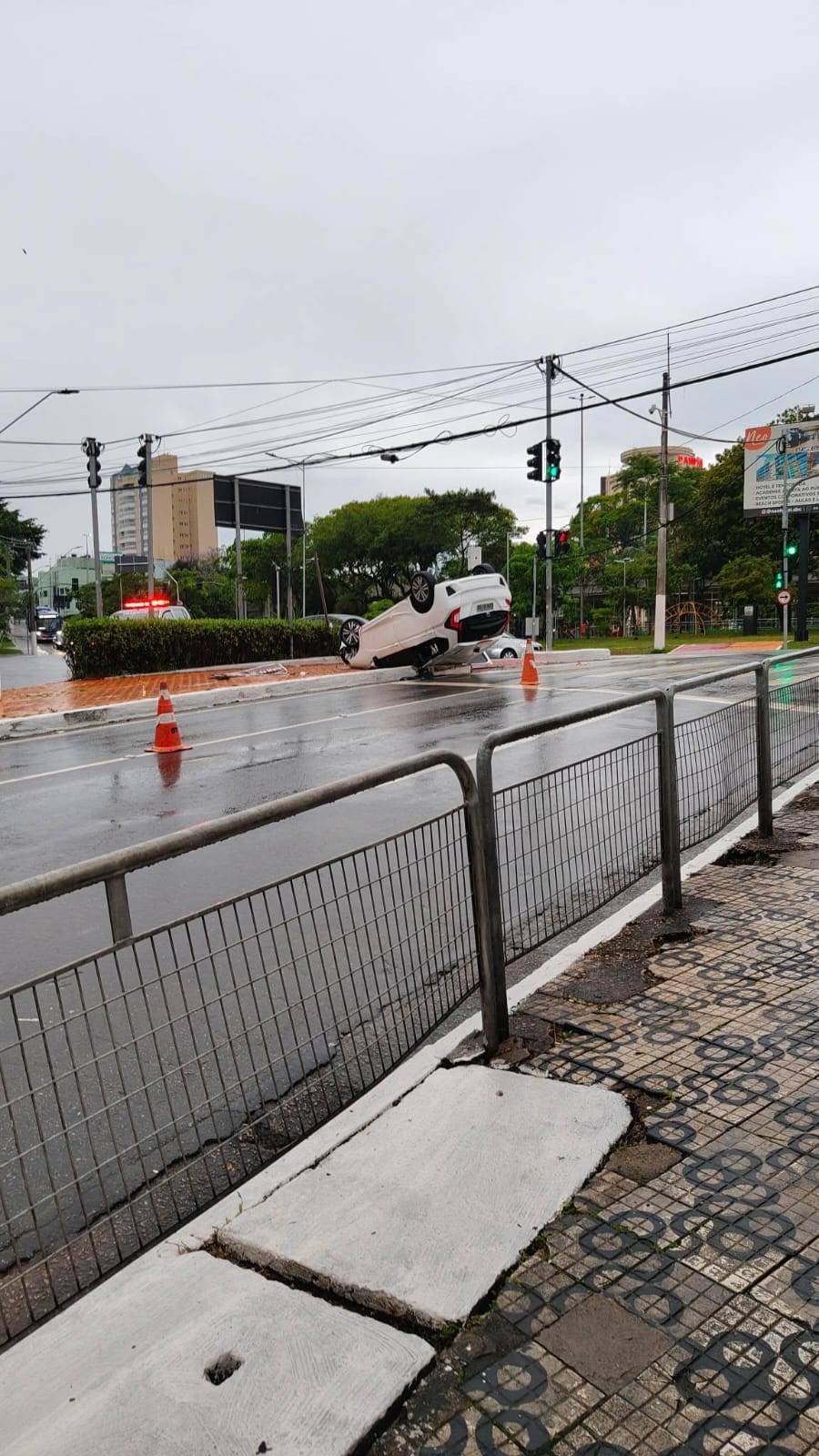 As informações iniciais indicam que o motorista perdeu o controle da direção e atingiu um HB20 que estava parado no semáforo, na terceira faixa de rolamento — uma das quatro existentes no trecho. Com o impacto, o veículo desgovernado raspou a lateral traseira direita do HB20, bateu na guia e acabou capotando.