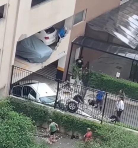 De acordo com relatos de moradores, a condutora tentava subir uma ladeira interna da garagem quando perdeu o controle do veículo. O carro desgovernado colidiu com um segundo automóvel que estava estacionado e, com a força do impacto, ambos romperam a proteção e caíram na área do condomínio.