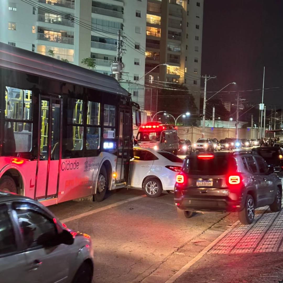 Um carro e um ônibus se envolveram em um acidente na noite desta terça-feira (24), na Avenida Senador Vergueiro, altura do número 823, em frente ao Edifício Paula, próximo ao Porão, em São Bernardo do Campo.