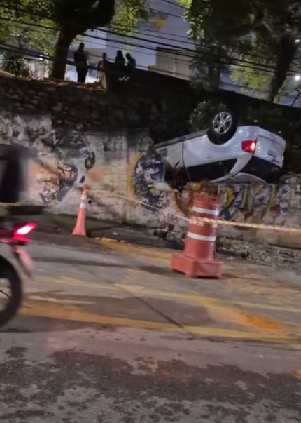 Na noite de sexta-feira (23), um carro que trafegava pela Rua Olavo Gonçalves, em São Bernardo do Campo, perdeu o controle em uma curva, bateu em um muro e caiu em um pequeno terreno entre a Rua Olavo Gonçalves e a Rua Norberto Antônio de Oliveira, na Vila Gonçalves.