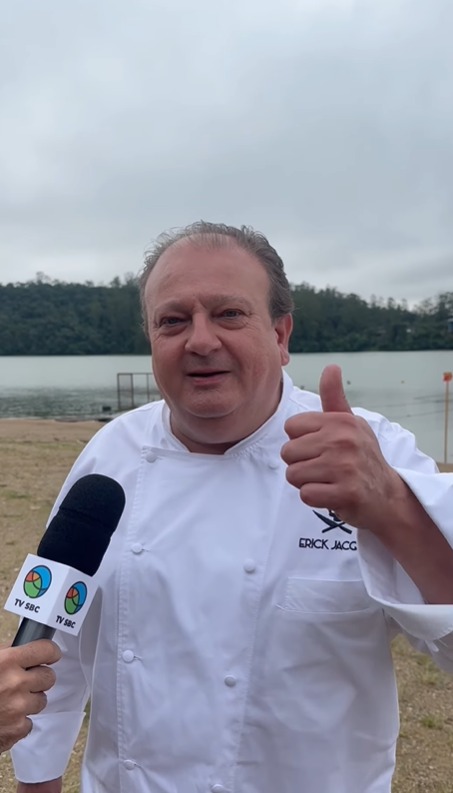 O chef Érick Jacquin conversou com a TV São Bernardo nesta segunda-feira (17) durante as gravações do Pesadelo na Cozinha no Riacho Grande. A presença do apresentador movimentou o bairro ao longo do dia, atraindo moradores e visitantes para o entorno do restaurante flutuante Caravelas, onde a produção da Band mantém a estrutura de filmagem.