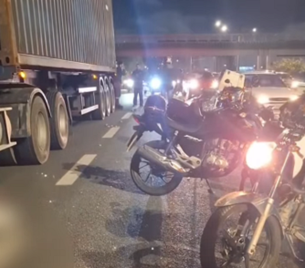 O carro trafegava na faixa da direita e a carreta na alça de faixa de aceleração e um motociclista foi passar no corredor, colidindo no caminhão. Na sequência, ele bateu na lateral do veículo de passeio.