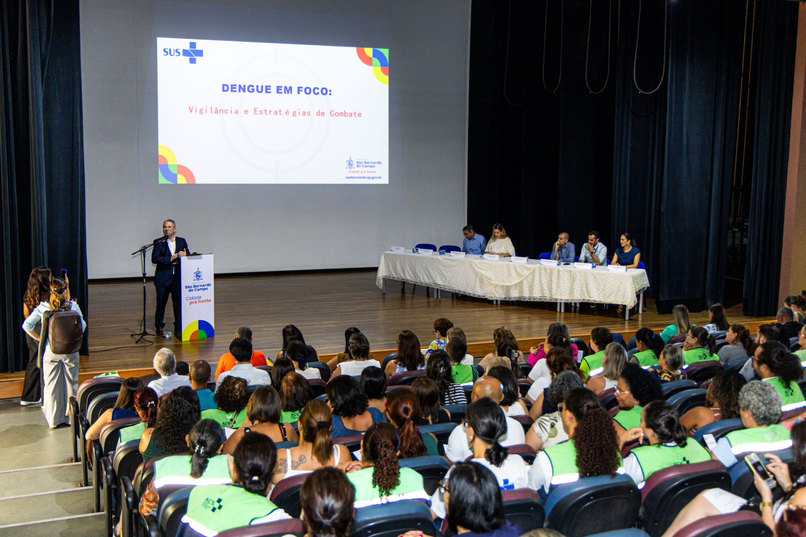 Em uma estratégia para potencializar o combate e a prevenção da dengue, que já conta com drones, nebulização e trabalho porta a porta, a Prefeitura de São Bernardo realizou nesta quinta-feira (27/2) o treinamento “Dengue em Foco: Vigilância e Estratégias de Combate”. O evento ocorreu no Teatro Inezita Barroso e reuniu 490 agentes comunitários de saúde, além de coordenadores das Unidades Básicas de Saúde (UBSs) e profissionais de diversas áreas, como Consultório na Rua, Centros de Especialidades Odontológicas e Departamentos de Vigilância Epidemiológica, Atenção Especializada, Urgência e Emergência, Apoio à Gestão e Apoio Administrativo.