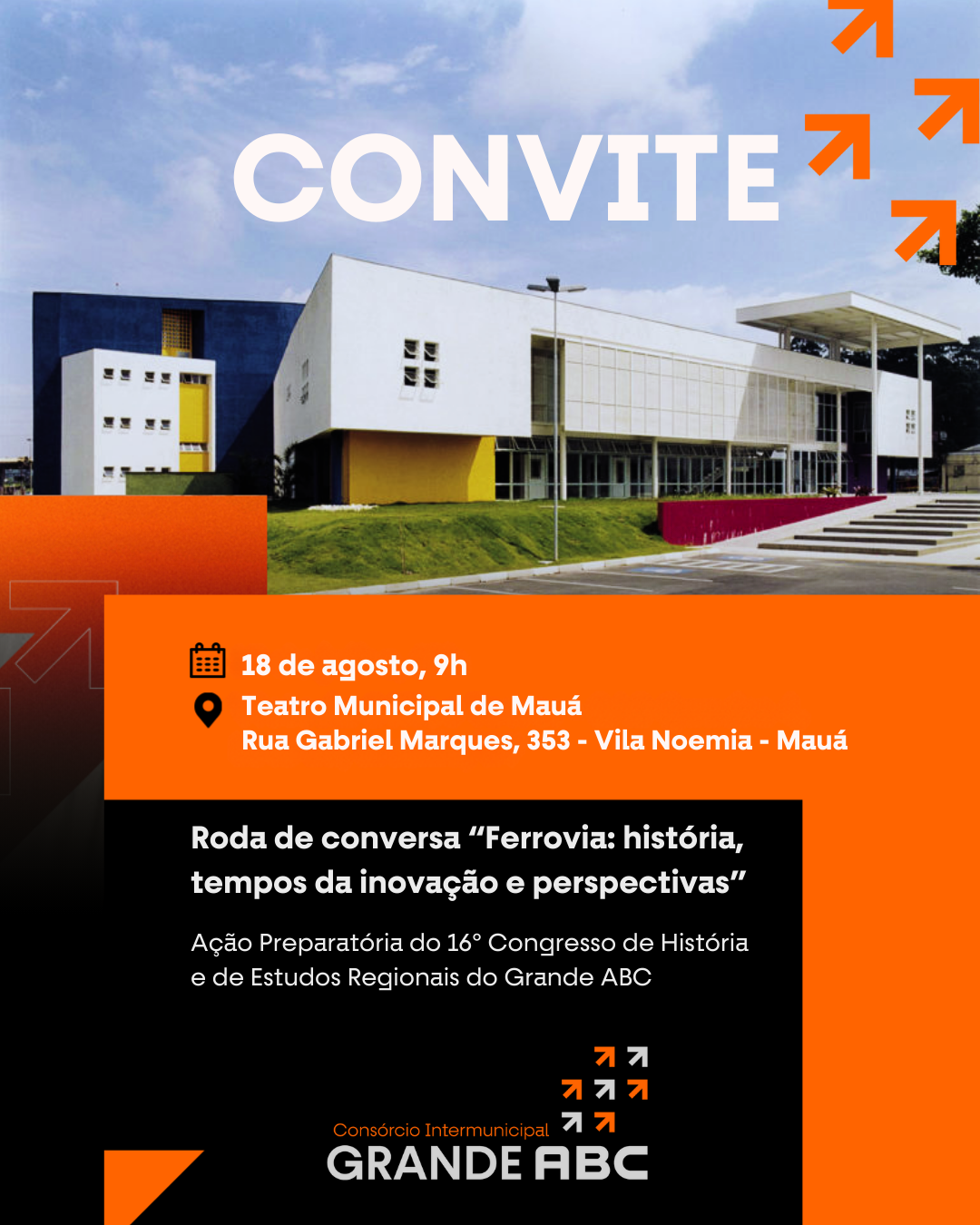 Organizado pelo Grupo Técnico História e Memória do Consórcio Intermunicipal Grande ABC, o encontro tem como convidados o pesquisador ferroviário Adalberto Dias Almeida e a professora Sílvia Passarelli, da Universidade Federal do ABC (UFABC). Durante o evento, haverá a apresentação da programação preliminar do 16º Congresso de História, que será realizado de 4 a 7 de novembro em São Bernardo do Campo.