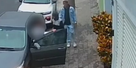 Imagens de câmeras de segurança mostram o momento em que os criminosos armados abordam a vítima, agridem e a derrubam no chão antes de fugir com o carro dela.