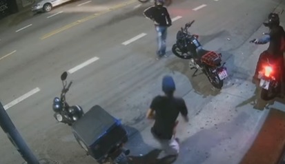 Uma câmera de segurança de um estabelecimento comercial registrou a ação e mostra o momento em que um dos criminosos chega na garupa de uma motocicleta e caminha até a moto da vítima, que estava estacionada. Enquanto isso, outro suspeito chega em uma segunda motocicleta. Em seguida, o pedestre aparece nas imagens e é abordado por um terceiro criminoso, que surge armado. Logo depois, os assaltantes levam os celulares e a motocicleta da vítima e fogem do local.