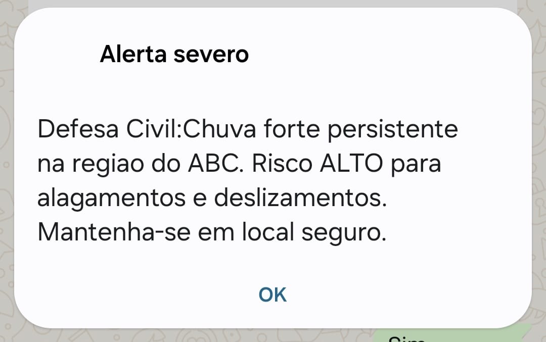 A Defesa Civil emitiu um alerta severo nesta segunda-feira (31) para a região do ABC, incluindo São Bernardo do Campo. De acordo com a notificação, há risco ALTO de alagamentos e deslizamentos devido à chuva forte persistente.