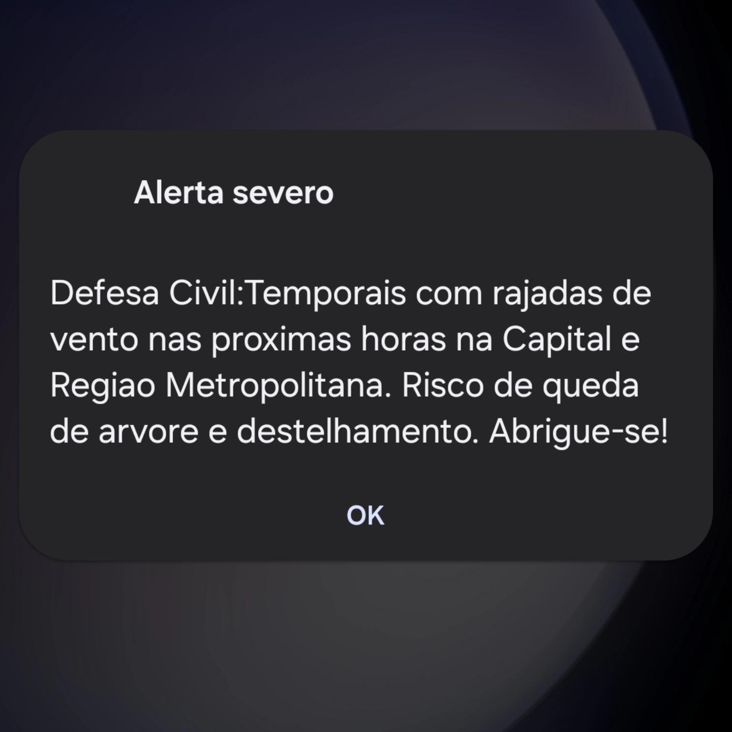O comunicado, disparado às 13h37, informa a previsão de chuvas intensas, temporais e rajadas de vento de até 90 km/h, com risco de quedas de árvores, destelhamentos e alagamentos em diversos municípios.