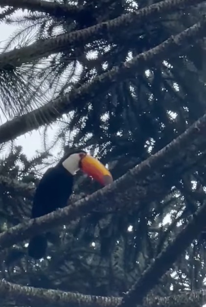 A ave foi vista pousada em uma árvore e, em seguida, na fiação da rua, rendendo registros e comentários da vizinhança. O contraste entre o dia cinzento e as cores vivas do tucano trouxe um momento de beleza e contato com a natureza na cidade.