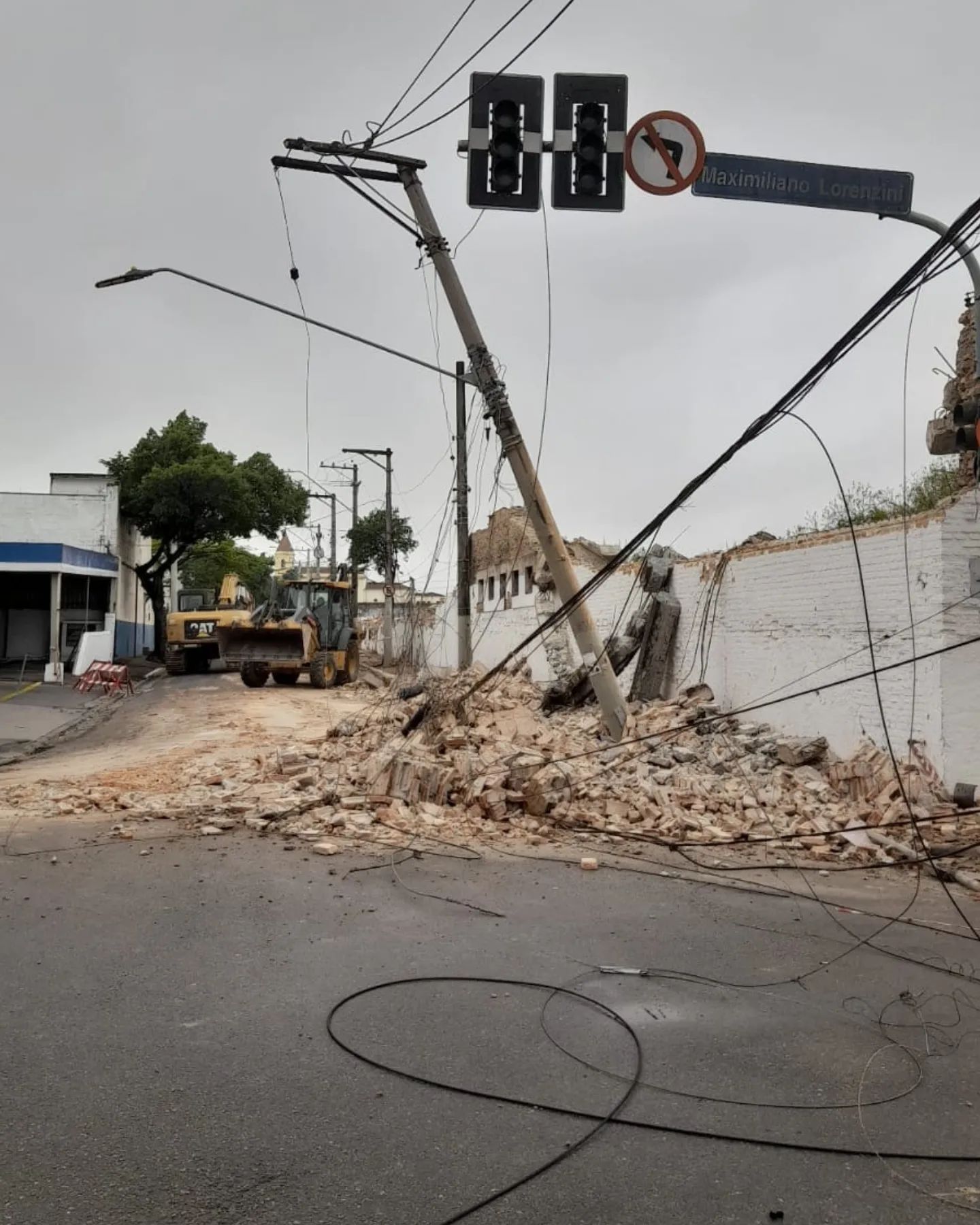 Neste sábado (19/10), um muro desmoronou durante a chuva e atingiu poste na rua Mariano Pamplona. Até às 20h30 a Enel ainda trabalhava para restabelecer a energia.