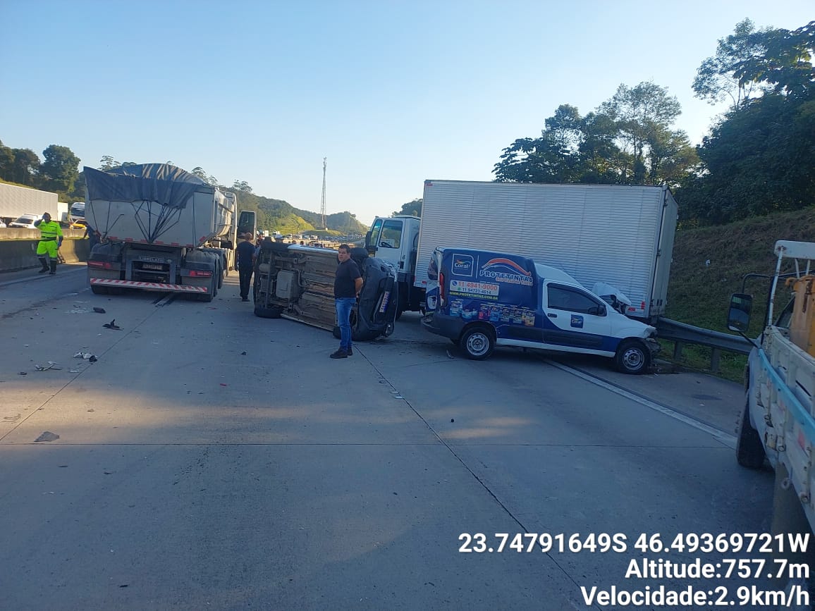 O tráfego segue congestionado do km 87 ao km 81 na pista interna. A Polícia Militar Rodoviária acompanha a ocorrência. Uma vítima leve foi socorrida e encaminhada ao Hospital Notre Dame, em São Bernardo do Campo.