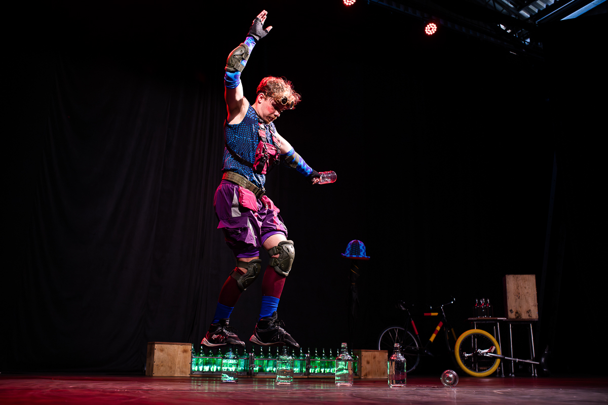 Guilherme Torres apresenta criação inédita no Espaço DAJUV com garrafas de vidro, monociclo e bicicleta acrobática