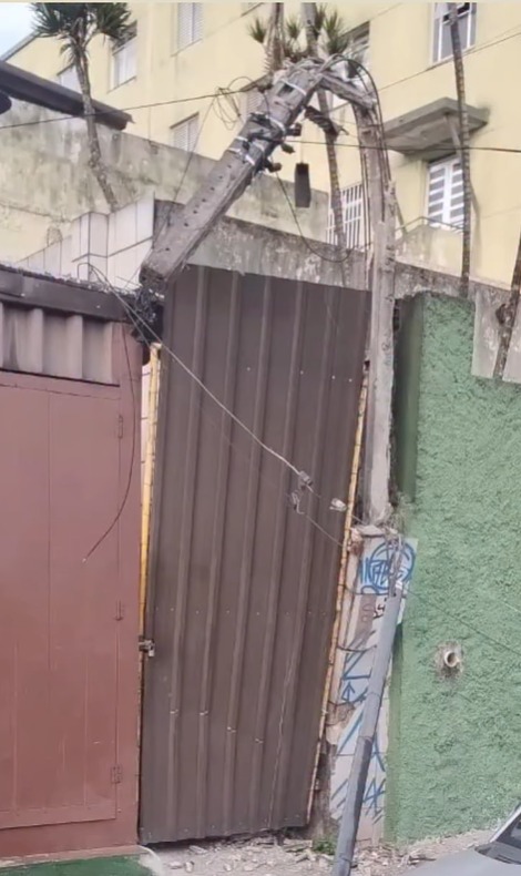 Na manhã deste domingo (13), moradores da Avenida Senador Ricardo Batista, no bairro Assunção, em São Bernardo do Campo, se depararam com fios caídos pela calçada e parte da rua, além de um poste de concreto entortado dentro de um imóvel.