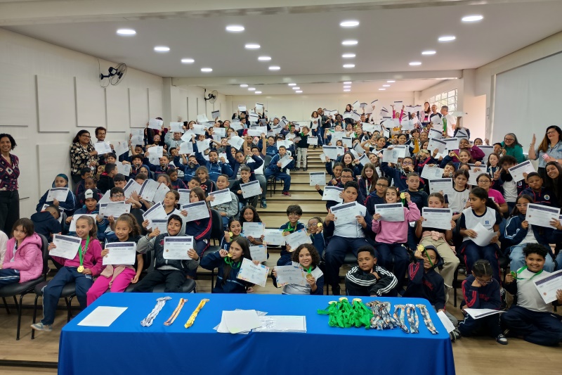Já na Olimpíada Brasileira de Astronomia e Astronáutica (OBA), que envolve estudantes do 3º ao 5º ano, a escola conquistou 22 medalhas: seis ouros, sete pratas e nove bronzes. O estudante Henrique da Silva Cruz é do 5ª ano A, da professora Ana Paula Terrabuio. Com a medalha de ouro da OBA no peito, ele diz que gostou da experiência: “Foi muito legal, eu gosto de astronomia, me preparei bastante e estudei muito. A professora Ana Paula me disse que eu tinha ido bem e achei que ia ganhar medalha de prata, mas conquistei o ouro!”.