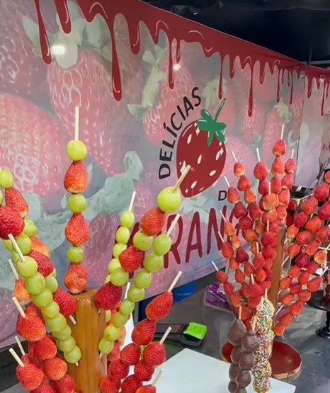 O morango, principal destaque da festa, aparece em várias opções, como espetos, bolos de pote, tortas, fondue, churros, waffles, milk-shakes, sorvetes e bebidas.