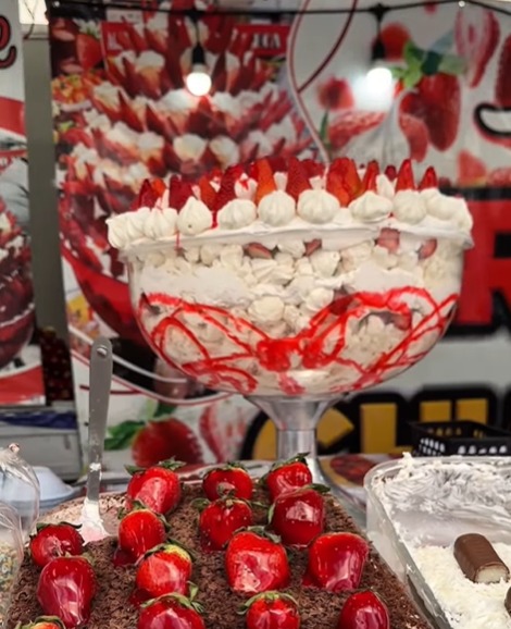Serão cerca de 30 expositores com opções como merengue, fondue, pastel, cocada, espeto, coxinha e até chopp de morango, além de pratos como baião de dois, espetinho de jacaré, frango no balde, camarão na brasa e doces típicos.