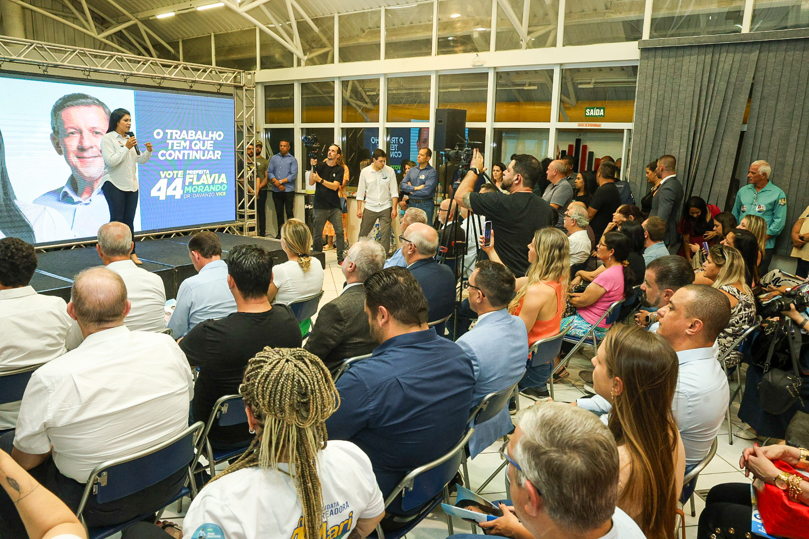 Durante a apresentação, Flávia destacou quatro eixos centrais de sua proposta: desenvolvimento econômico, desenvolvimento social, desenvolvimento urbano e ambiental, além de tecnologia e inovação. “Tudo que eu vou apresentar aqui pra frente foi baseado nesses quatro exemplos”, declarou a candidata.