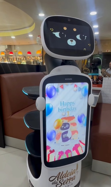 Além de levar as refeições, conferimos também o robô cantando parabéns, pronunciando frases de recepção e interagindo com os clientes. O equipamento ainda oferece a opção para que o público tire fotos e marque o perfil do estabelecimento nas redes sociais.