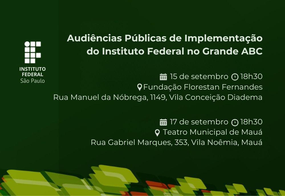 O Grande ABC promove, na próxima semana, a segunda série de audiências públicas para a implementação dos dois primeiros campi do Instituto Federal (IF) na região, que serão instalados em Diadema e Mauá.