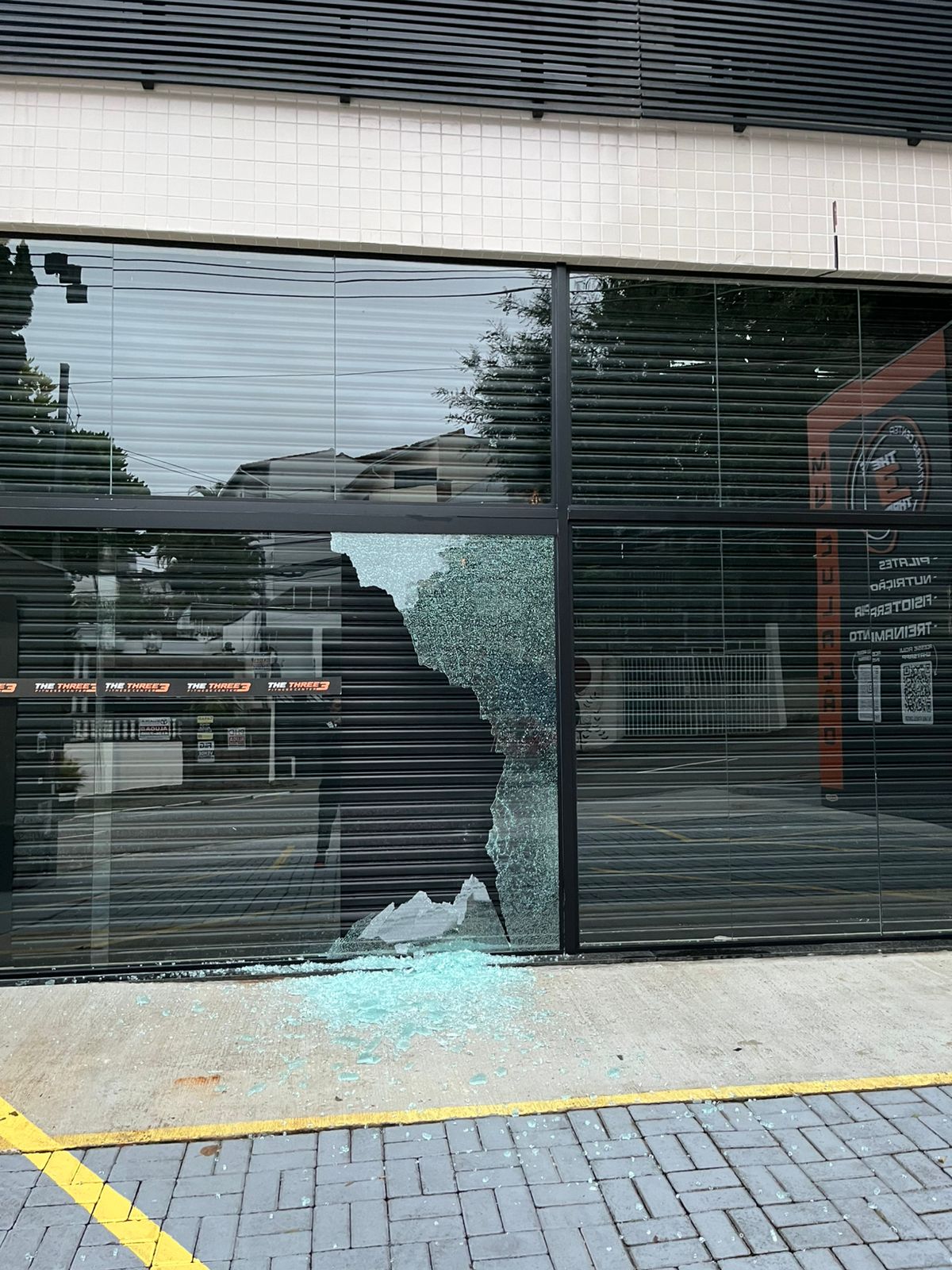 Além dos danos em coletivos e pontos de ônibus, câmeras de segurança também flagraram o suspeito atirando pedras contra imóveis na Rua Kara, incluindo a fachada de uma academia e de um restaurante.