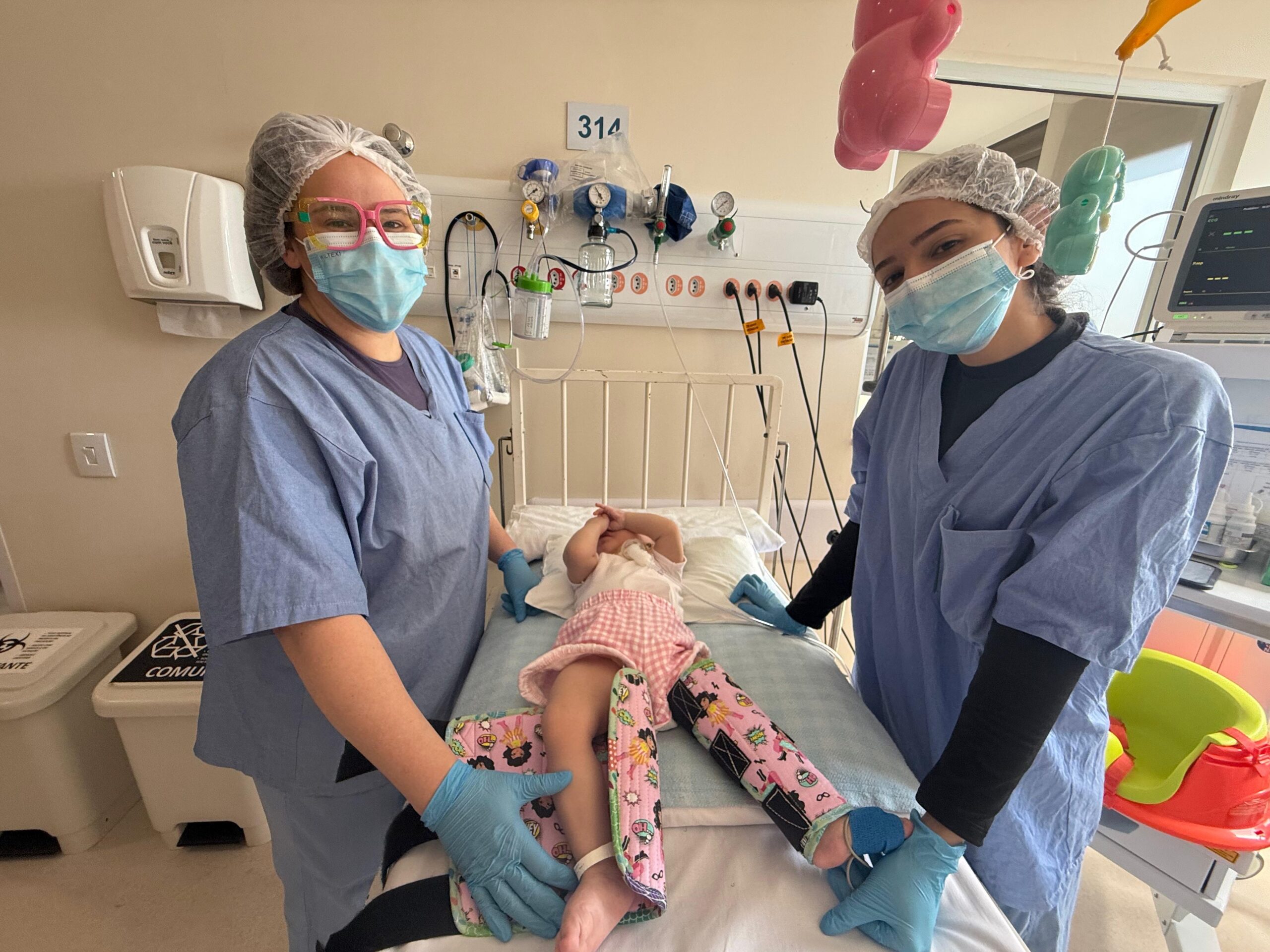 Recentemente, uma importante conquista emocionou a equipe multidisciplinar do hospital: Lívia pôde ficar em pé pela primeira vez, com o apoio de uma órtese confeccionada especialmente para ela. A iniciativa nasceu da atenção integrada dos profissionais de fisioterapia e terapia ocupacional, com o objetivo de ampliar os estímulos motores e oferecer mais qualidade de vida à criança.