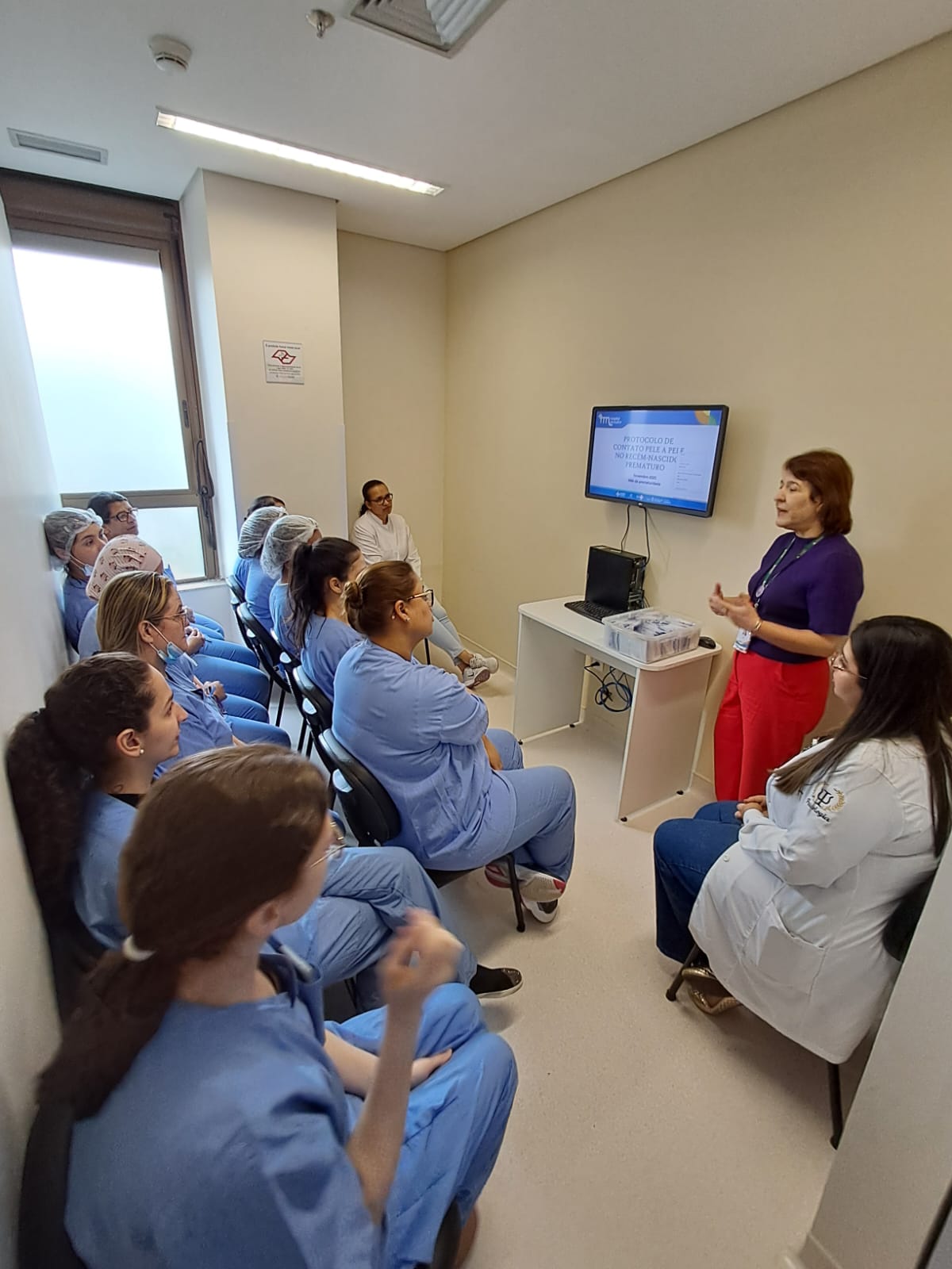 CUIDADO – A diretora técnica da unidade, Dra. Adlin Veduato, ressaltou a iniciativa no contexto do Novembro Roxo. “Atualizar protocolos é reafirmar nosso compromisso diário com a vida. A prematuridade exige respostas rápidas, qualificadas e sensíveis, e o contato pele a pele precoce representa exatamente isso: ciência aliada ao cuidado, fortalecendo a família desde o primeiro instante do bebê.”