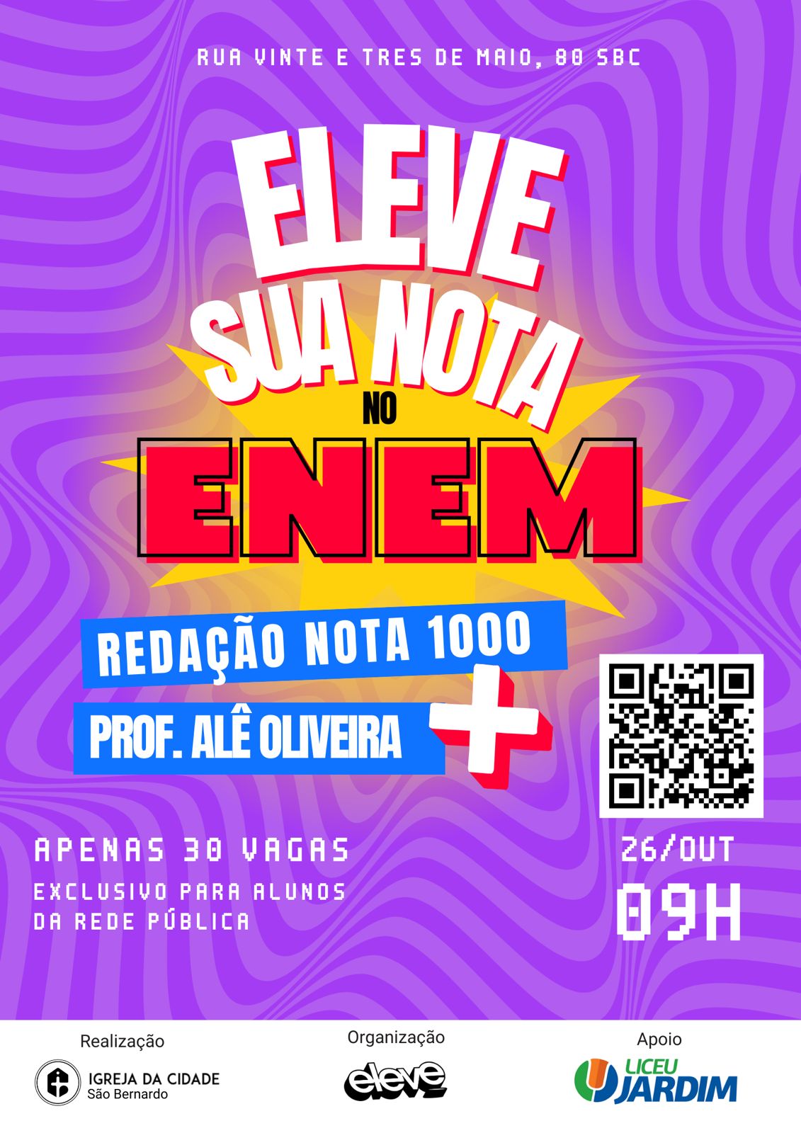 A Igreja da Cidade em São Bernardo do Campo, através do Eleve, promove o evento “Eleve sua Nota no ENEM”, voltado para estudantes da rede pública que farão o ENEM em 2024. O evento contará com uma aula de redação ministrada pelo professor Alê Vieira, especialista em preparação para a prova.