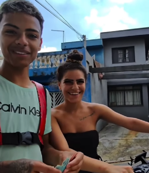 No registro, Márcio, que estava dentro do carro, aborda o casal de namorados Junior e Eloa, que descia a rua com uma bolsa de entrega. Ele pergunta sobre a história dos dois e, em um gesto solidário, entrega ao casal uma nota de R$ 100,00. A dupla, que namora há dois anos, agradece a atitude. A publicação recebeu elogios de internautas.