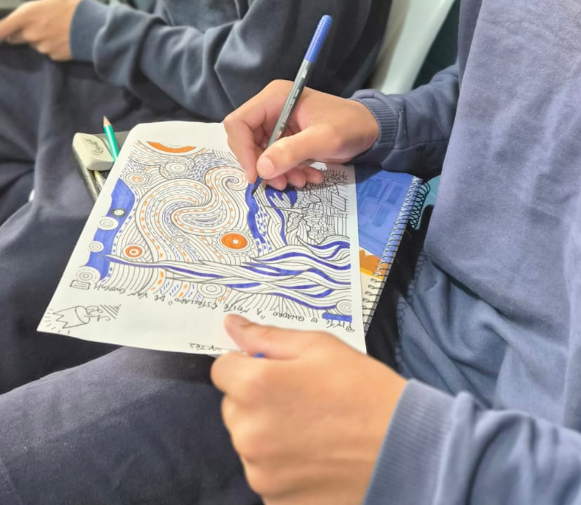Utilizando lápis, canetinhas e papel, os jovens, que estão em estágio de conclusão do Ensino Fundamental, exploraram seu potencial a partir das orientações da professora Ivana Prates, docente da escola vinculadora E.E. Mathias Otávio Roxo Nobre. Eles colocaram em prática os conceitos aprendidos em sala de aula, como profundidade, formas ondulares e o uso das cores como expressão do sentimento, que são características das pinturas do autor.
