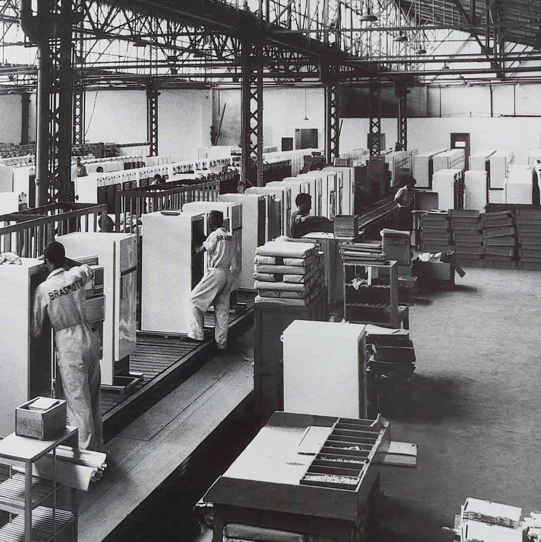 📷 Imagem. Linha de produção de geladeiras na Brasmotor. Década de 1960. A imagem original foi publicada na página 52 do livro “O futuro sem fronteiras – A história dos primeiros 50 anos da Brasmotor”, editado pela empresa em 1995.
