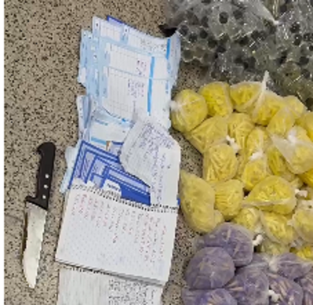 Também foram apreendidos um celular, materiais para embalo, uma faca e três cadernos com anotações contábeis do tráfico.