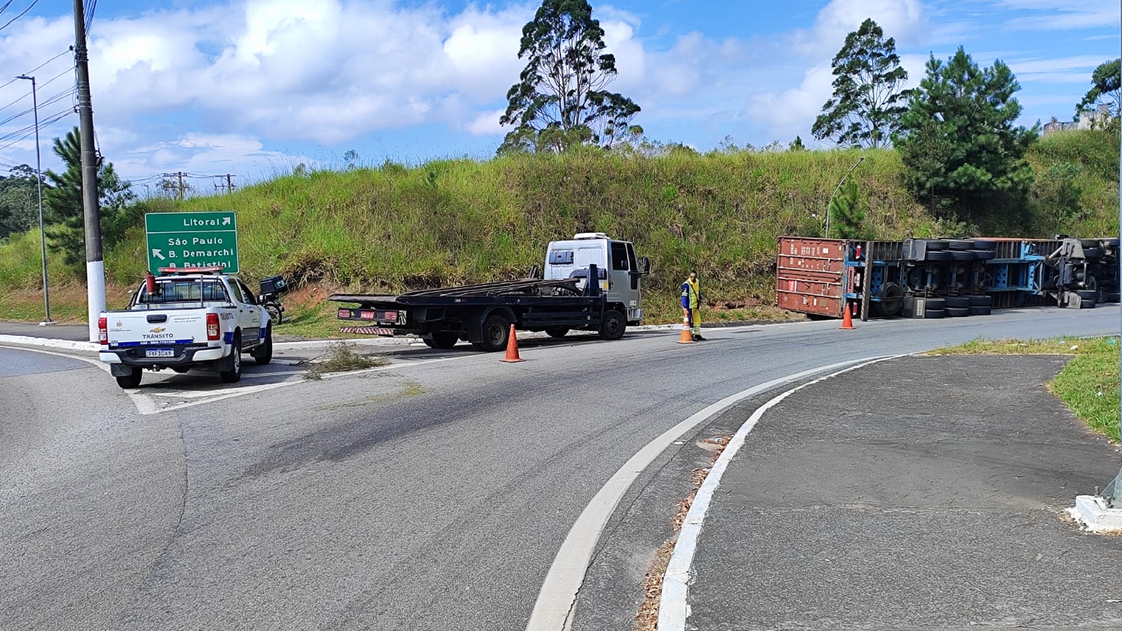 Uma carreta que transportava um contêiner tombou na rotatória do Jardim Represa, na altura da Estrada Galvão Bueno, no acesso à Rodovia dos Imigrantes. O acidente ocorreu por volta das 13h desta segunda-feira (10).