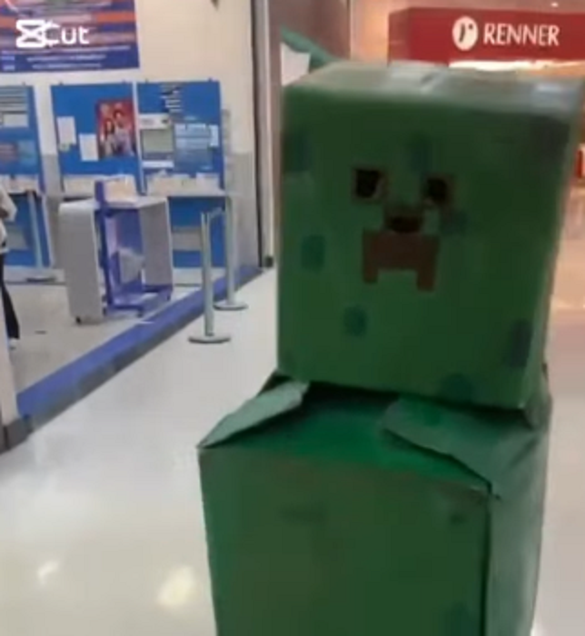A ideia partiu do próprio Gustavo, que queria assistir ao filme “Um Filme Minecraft” caracterizado. A fantasia foi feita com caixas de papelão, spray verde e chinelos colados por dentro da estrutura, permitindo que ele andasse com facilidade.