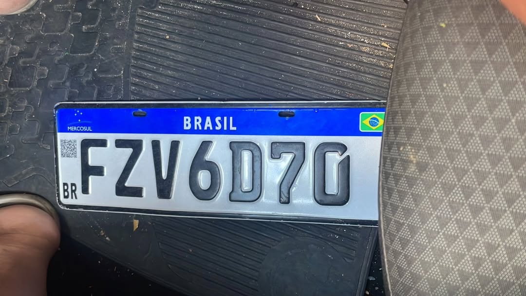 Durante a busca, ele acabou encontrando outra placa de veículo na rua. O objeto localizado é do padrão Mercosul e tem a identificação FZV6D70.